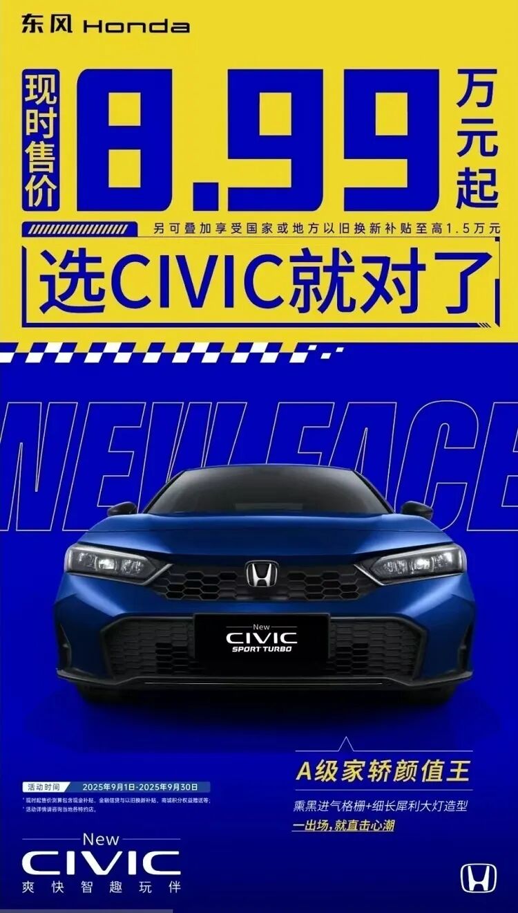 近日,本田思域推出“现时起售价8.99万元”活动,另可叠加享受置换补贴1.5万元,并提供“终身质保”权益。